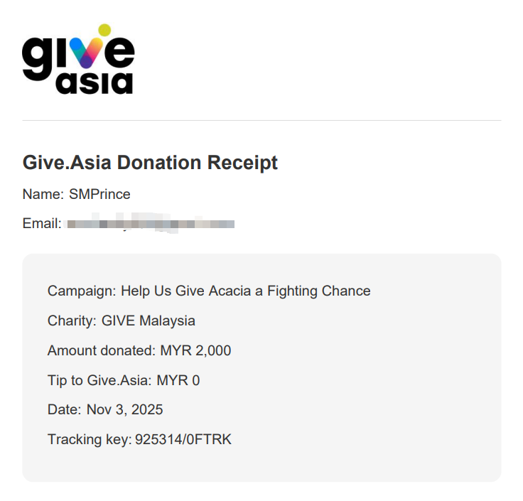| 03/11/2025 | Help Us Give Acacia a Fighting Chance | MYR 2,000.00 | more |